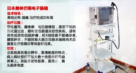 日本奥林巴斯电子结肠镜,被誉为“精明的电子胃肠镜”,该系统具有高分辨率,高清晰度的特点,可使病人病灶部分图象清晰地显示在电脑屏幕上。其镜身韧性极高,直径小,镜头能多角度、多方位的进行检查治疗,全新、高智能电脑工作站,可进行随机描图,便于病变的对比、查询、会诊等。对胃炎、溃疡病、消化 道出血、食道癌、胃癌、大肠癌、大肠息肉、各种肠炎等疾病的诊断和治疗有着决定性的作用。>>>肠镜检查费用多少?免费问医生